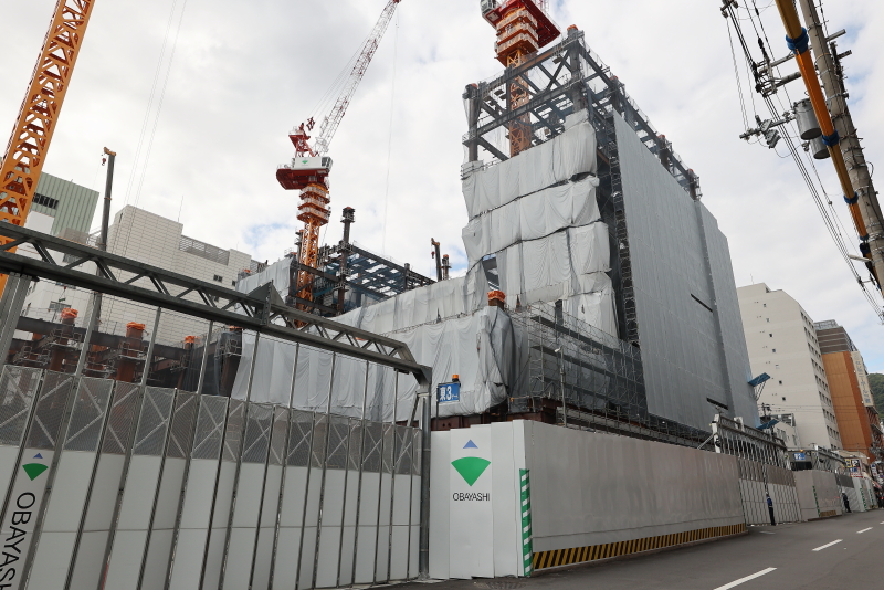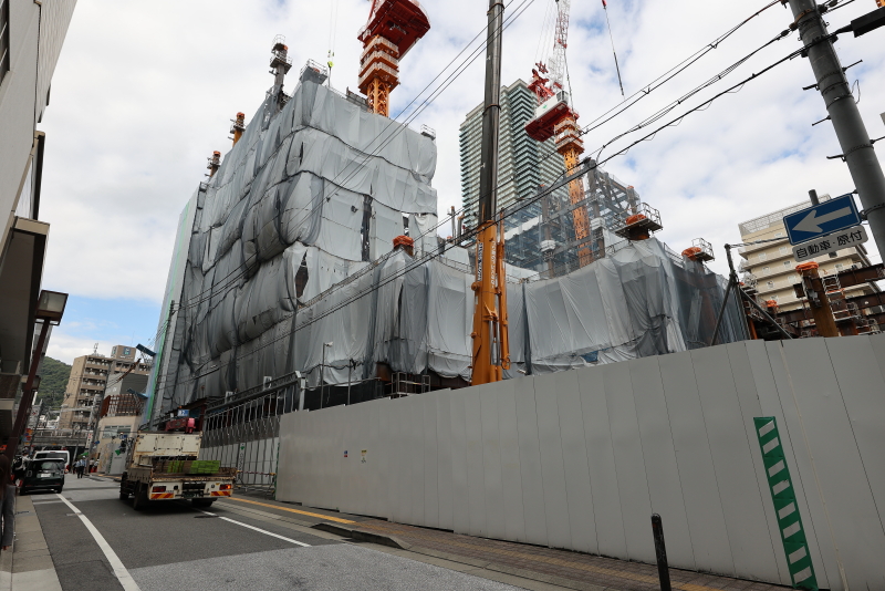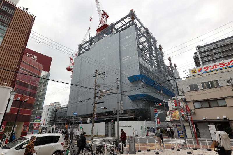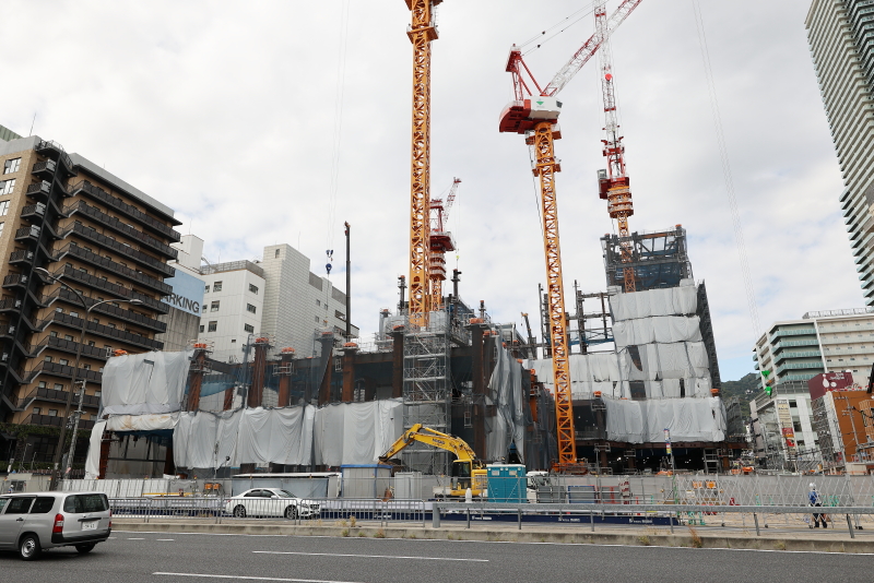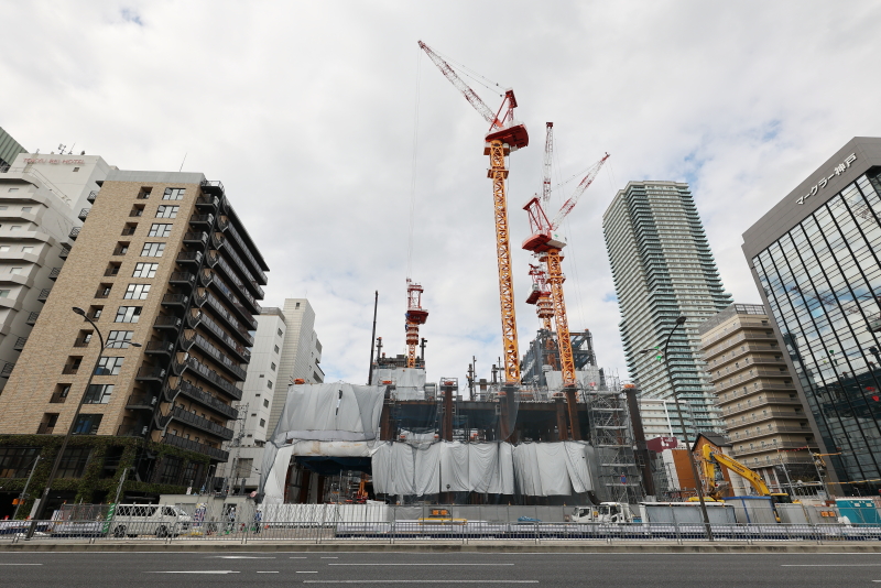 ビル本体の建設工事と既存建物の解体撤去工事が敷地内で同時進行している神戸三宮雲井通5丁目地区第一種市街地再開発事業。2027年12月 …