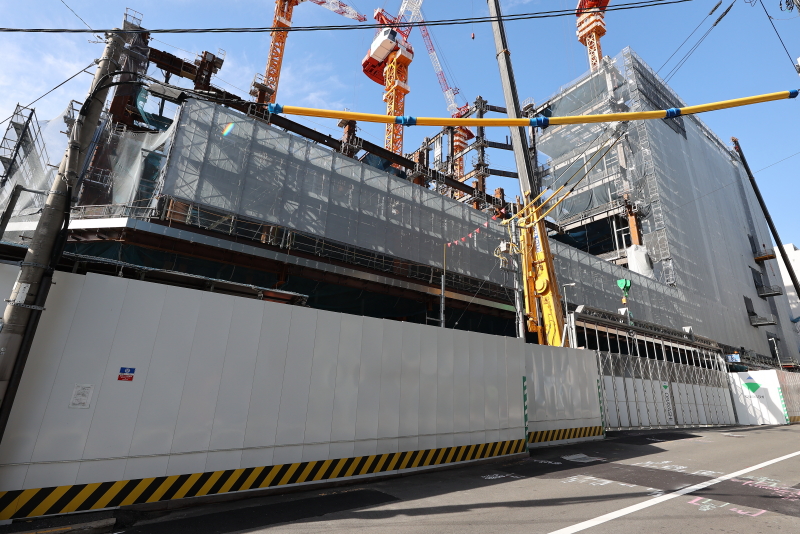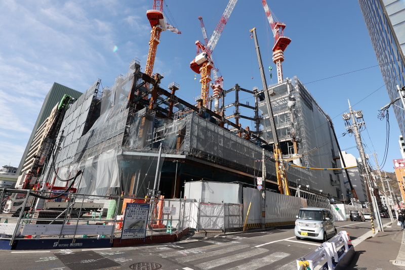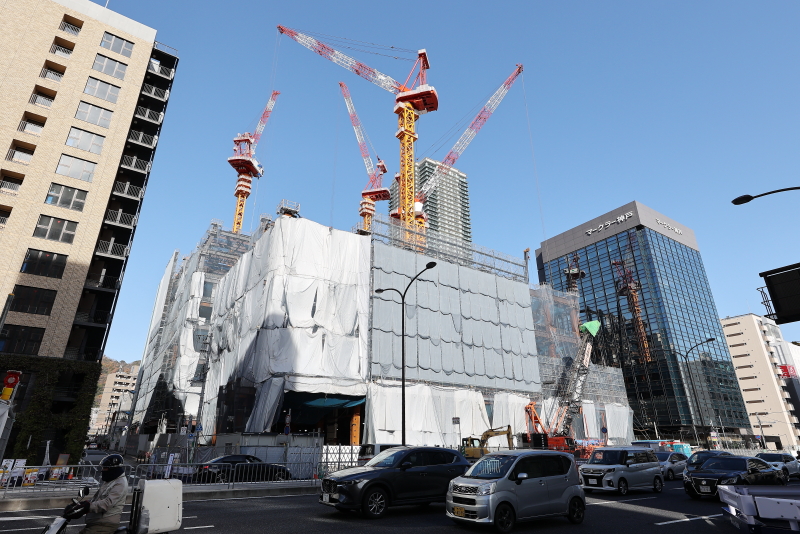 順調に建設工事が進められている神戸三宮雲井通5丁目地区第一種市街地再開発事業。神戸三宮ツインゲートの1期棟は、4機のタワークレーンを駆使して近年の神戸都心では類を見ない規模の開発工事が行われています。