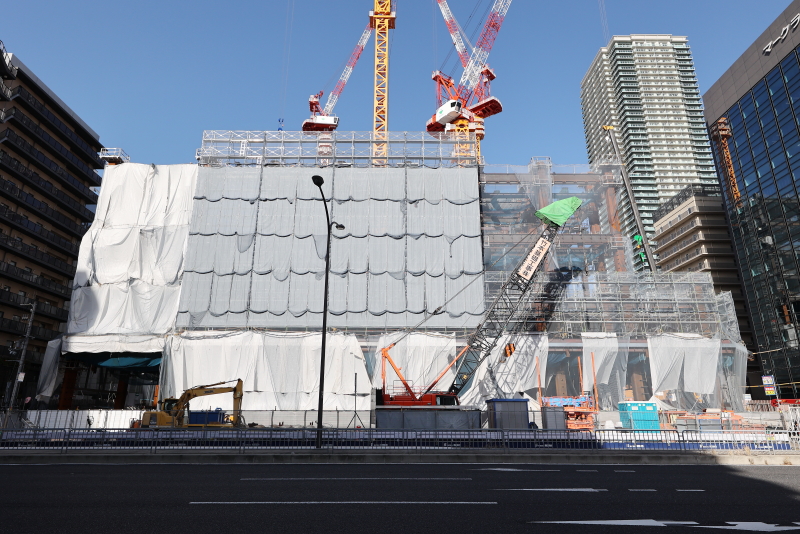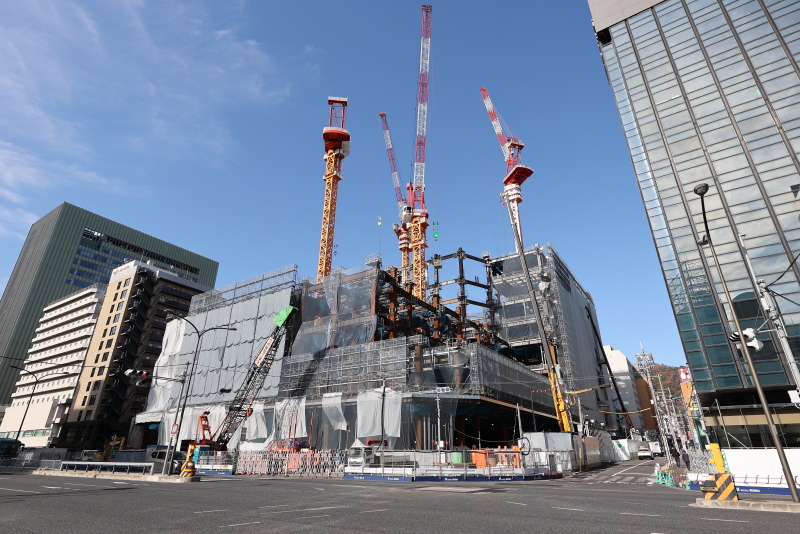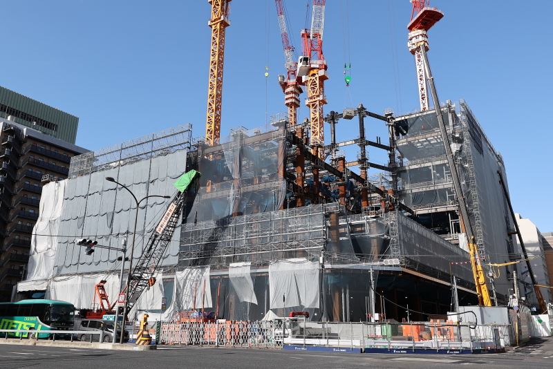 地上10階 高さ60mとなるビルの基壇部の鉄骨工事が進められており、敷地の南北で進捗率に依然と差があるものの、両工区で複数階までの鉄骨建方とデッキプレート設置、コンクリート打設等の躯体工事が行われています。