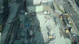 南工区の基壇部の鉄骨建方もいよいよ佳境に入っています。これが完了すると、いよいよオフィス・ホテルの入る中高層部の躯体が立ち上がっていく事になります。高さ100mを超えるのは、オフィスフロアの20階位に到達時でしょうか。
