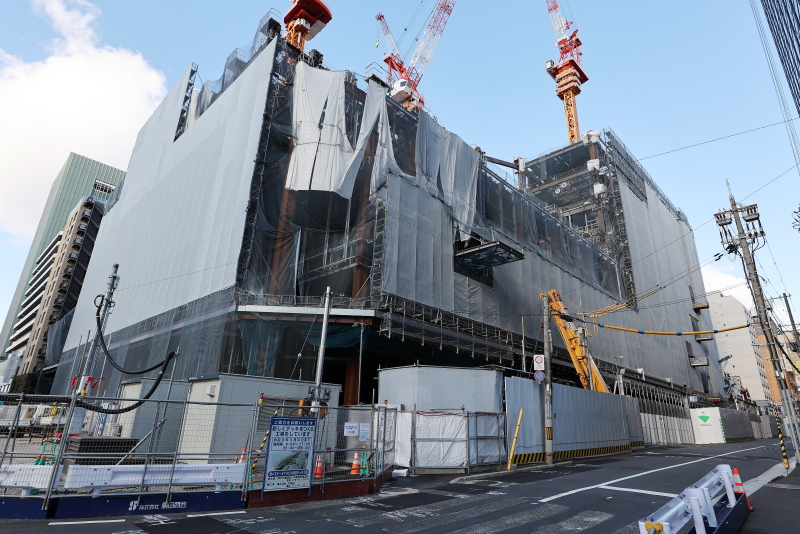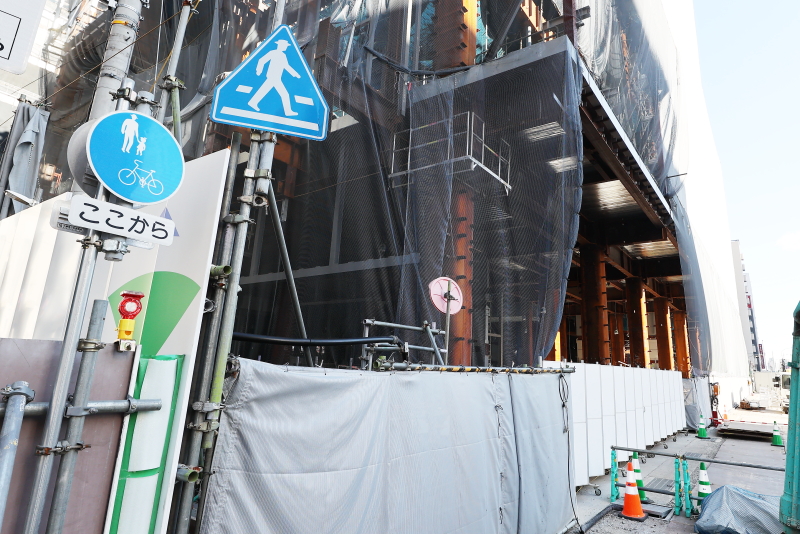 巨大な躯体は周囲のビルの高さに迫ってきました。従前は複数の比較的大きな建物から構成されていた街区が今やたった1棟の建物に集約されています。