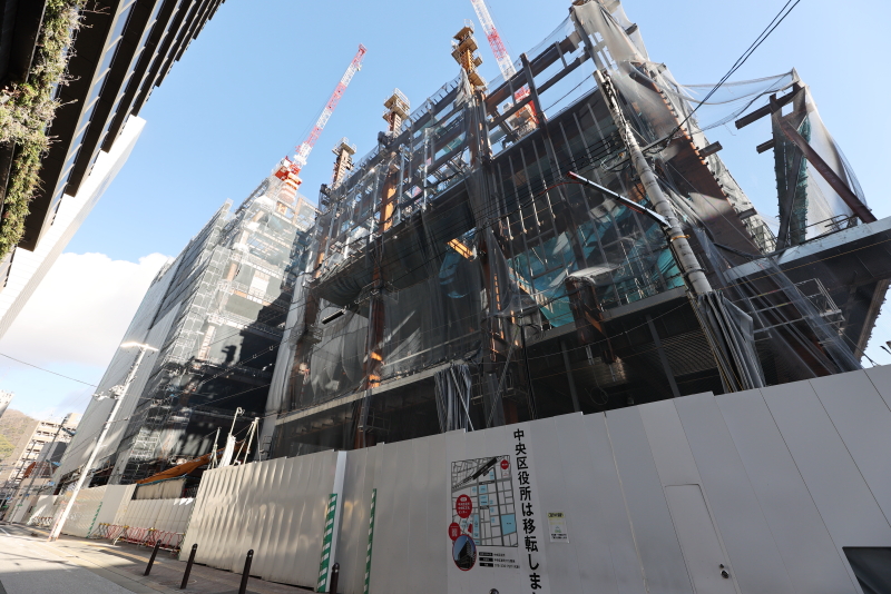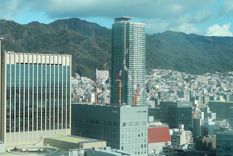 タワークレーンが伸びてきた事で、高層部が立ち上がってくる場所が特定できるようになりました。市役所展望ロビーからは、シティタワー神戸三宮を隠すように神戸三宮ツインゲートが建つ形になります。