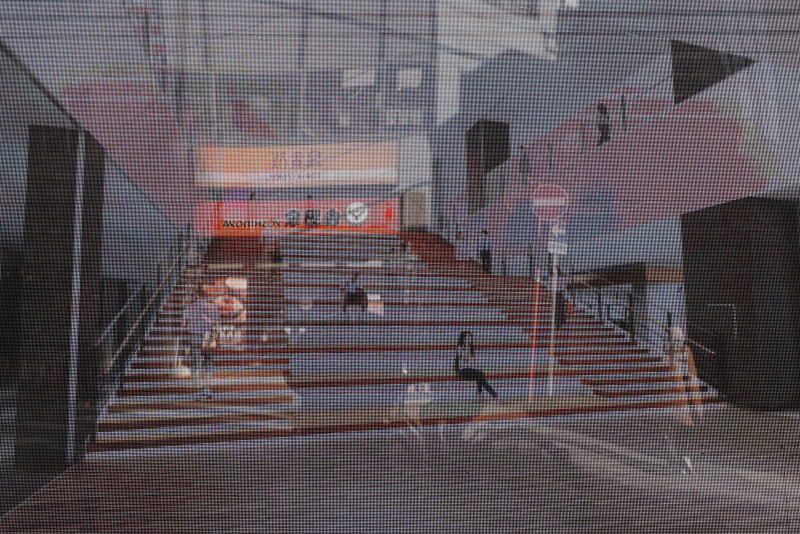 バスタの2-3階に整備される予定の吹き抜けと大階段・ベンチのイメージパースです。仮囲いのデジタルサイネージには、神戸三宮ツインゲートの未公開イメージが幾つも放映されています。周囲の映り込みが強く、見辛い点はご容赦下さい。開放的な空間が生まれる予定です。