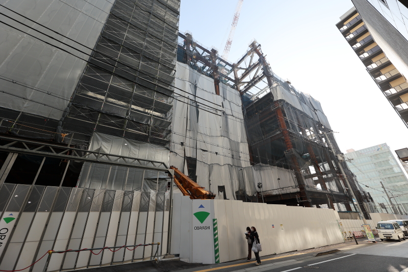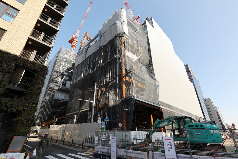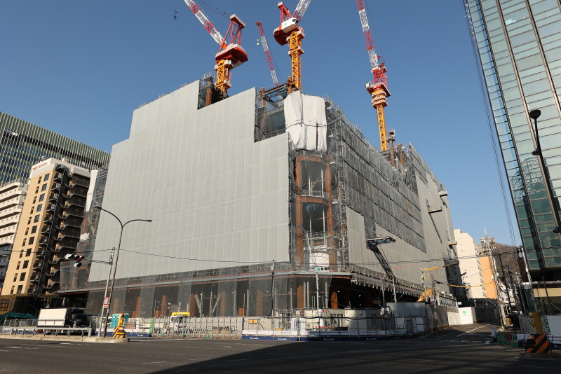 中央部は既に更に高いフロアに達している模様です。既に大部分が足場に覆われています。アシックスやシスメックスの入るオフィスフロアの鉄骨建方が開始されるのが非常に楽しみです。多くの現場で、モックアップの壁面を設置する例がありますが、この工事ではモックアップは見かけられていません。