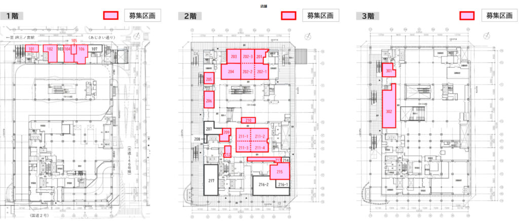 1-3階の商業テナントについても募集が開始されています。1階はあじさい通り沿いに7区画が設けられ、その内5区画でテナントを募っています。2階は最も区画数が多く、20区画以上が設けられます。3階は待合サービス施設に床の多くを割く為、募集は2区画のみ。地下1階には最も大きな床が提供されますが、テナントは募集していません。恐らくフードコートが運営されるのではないかと思われ、オペレーターが別途、テナントを誘致するのではないかと思われます。
