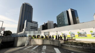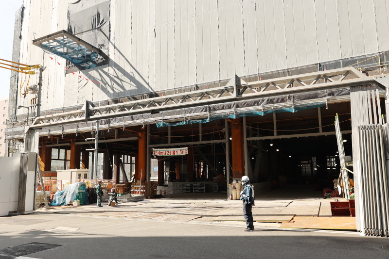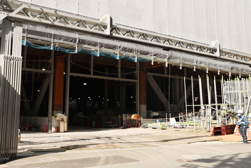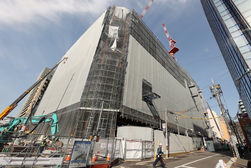 工事が先行していたサンパル跡の北工区と後を追いかけてきた中央区役所や勤労会館跡の南工区がほぼ完全に一体化し、高さ60mの大きな基端部が姿を現しました。周囲の建物を圧倒する存在感です。