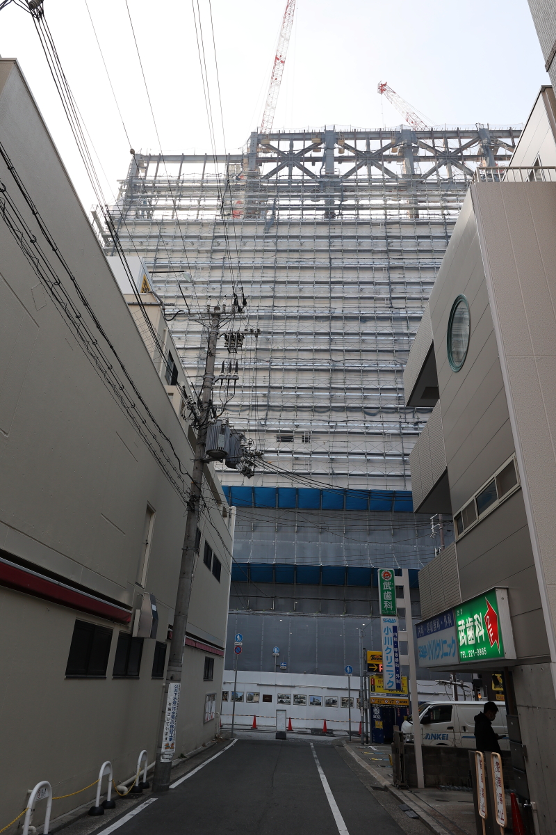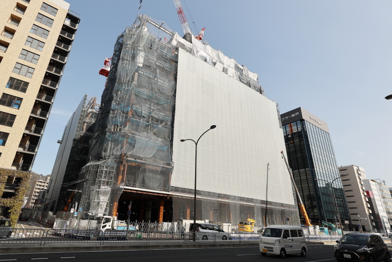 基壇部はほぼ全面を足場と養生ネットで覆ってしまうので、その後の工事の進捗を把握しにくいですが、高層部については鉄骨工事の後、カーテンウォールの取り付け作業が確認できるので、ビルが形になっていく様子を追う事ができます。アシックスとシスメックスの本社フロアがこれから構築されるのが楽しみです。ベイサイド迎賓館や山手迎賓館を運営するテイクアンドギヴ・ニーズが手掛ける最高層部に入るEVOL HOTEL KOBEについての続報もそろそろ欲しいところです。進出が発表されて以来丸4年。その後の詳報は出てきていません。