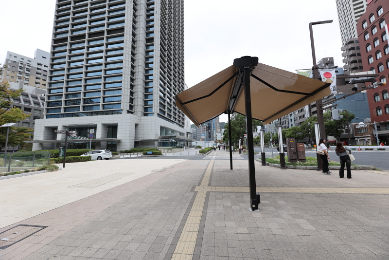 市役所南側の交差点に日除けのシェードが設置されました。まだ社会実験的な位置付けでしょうか。待ち時間の長い信号には今後、必須になっていくのかもしれません。
