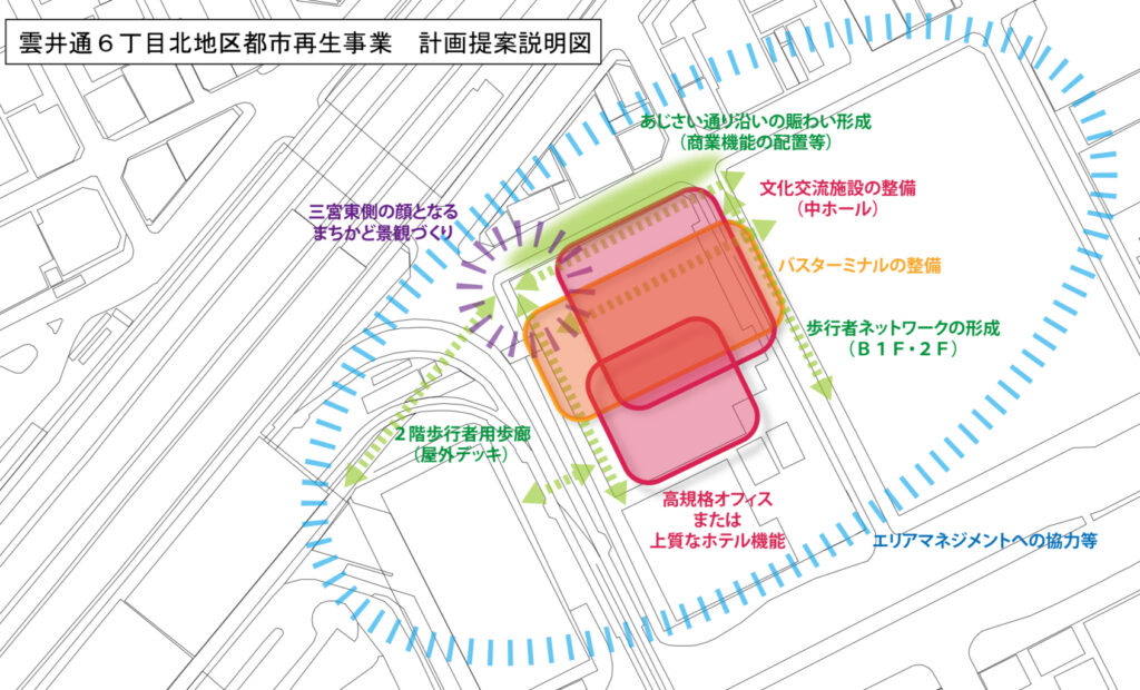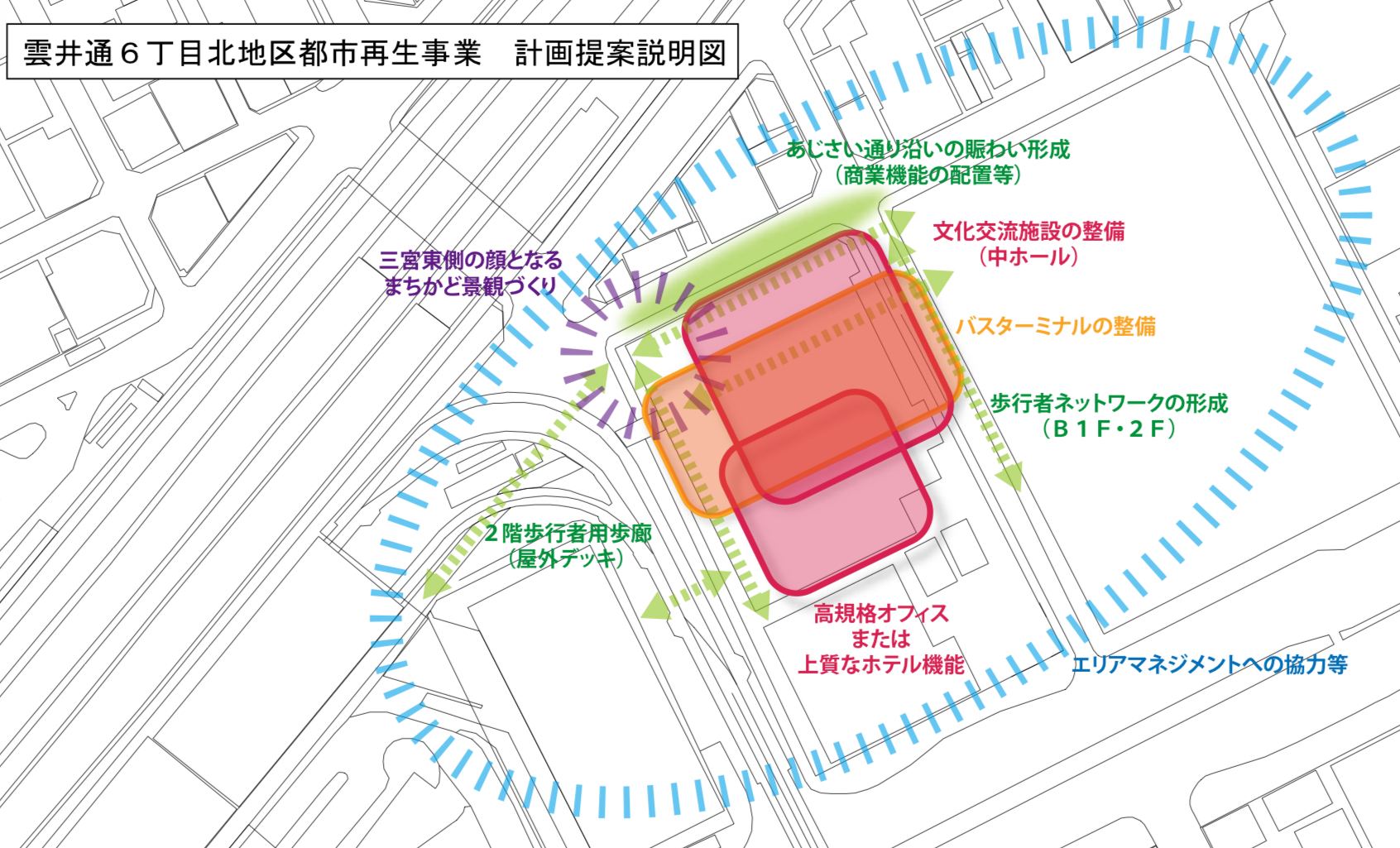 低層部は雲井通5丁目地区同様にバスターミナルとし、2つの建物の低層部は繋がる想定で、合計10バース以上が整備される計画でしたが、気になるのは建設中のI期ビルの東面のデザインがそのようにビルを将来的に繋げる仕様になっていない事、2つのビル間に上空デッキで連絡する構想がある事等から、既に2棟は独立した構造に落ち着く可能性が高いと思われます。