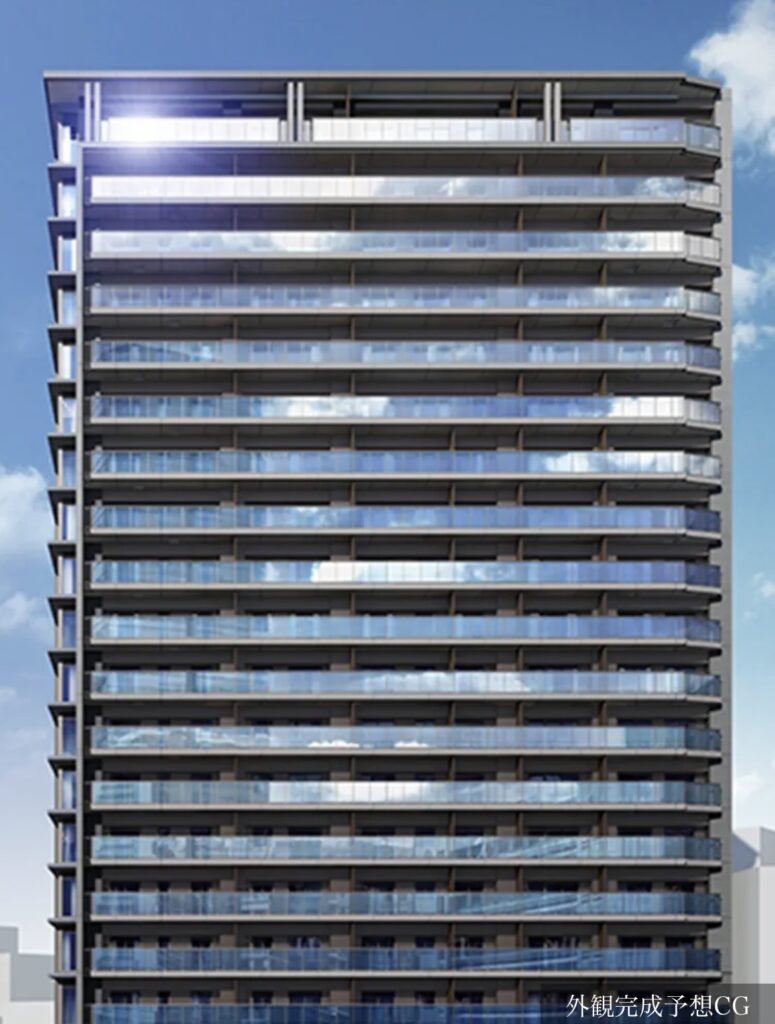 サイトで公開された完成予想イメージ。JRこ神戸線高架に面した東側のファーケードを描いた様子と思われます。透明のガラス手摺を基本とし、南側の角住戸はコーナーサッシを採用。上層階からはポートタワーは望めるのでしょうか。