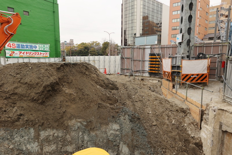杭工事の完了した現場では、掘削が進みます。既存建物の一部地中壁を山留に再利用しています。