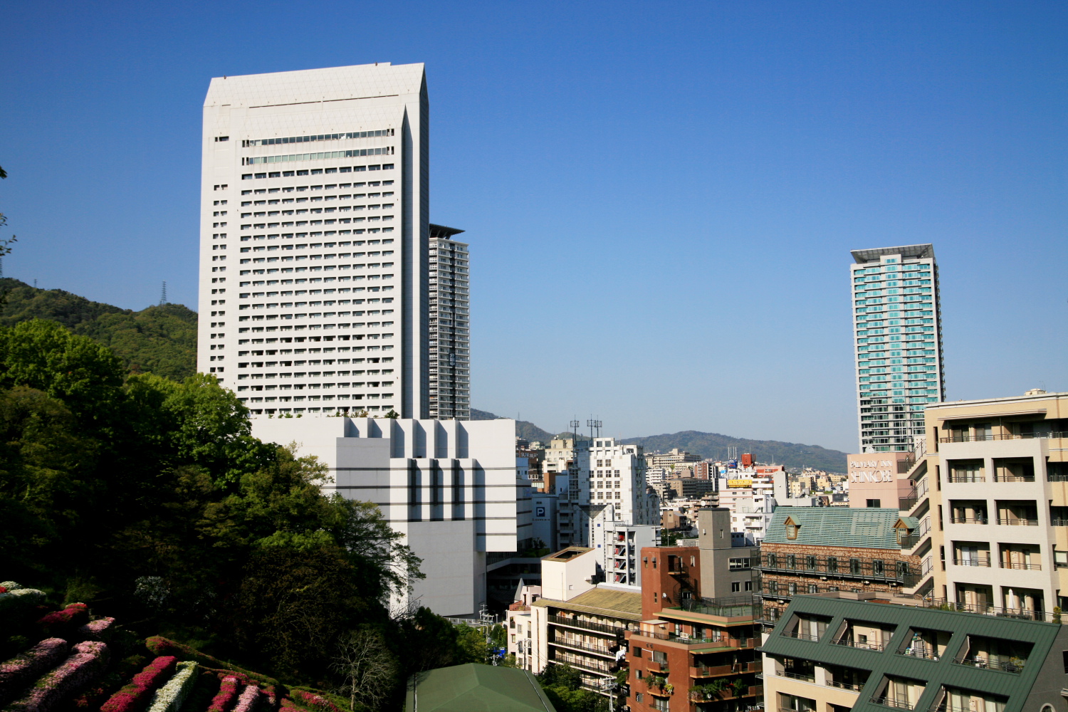 北野界隈は新神戸のトリプルタワーを間近に見上げるのにとても適した場所です。新神戸駅から取り囲まれるように見上げるのともまた違った視点で新鮮です。よく見渡すことができるのは北野浄水場で今のシーズンは併せてツツジが綺麗です。