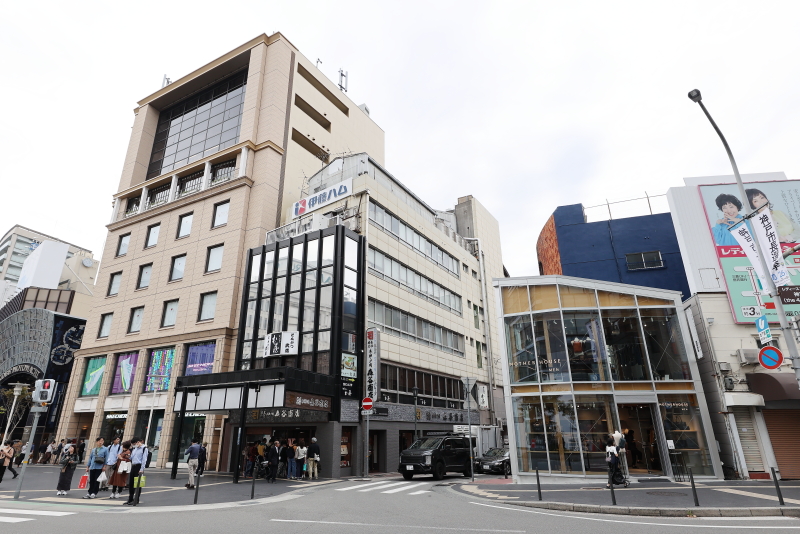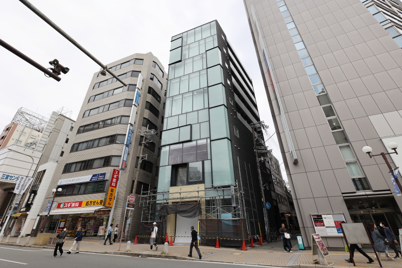 新築以来初の大規模な改修工事が行われている鯉川筋のHK元町ビル。カーテンウォールのファサードがスタイリッシュな複合ビルで、立地パーキング跡地に建設されました。