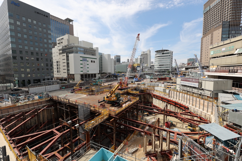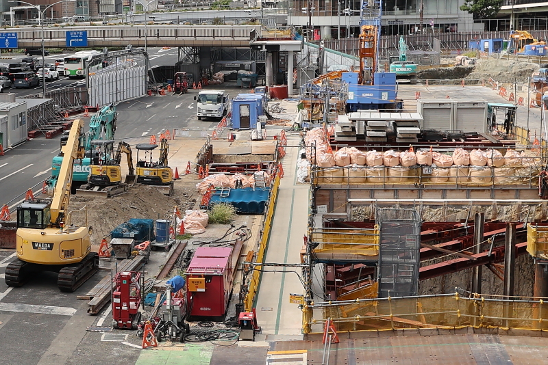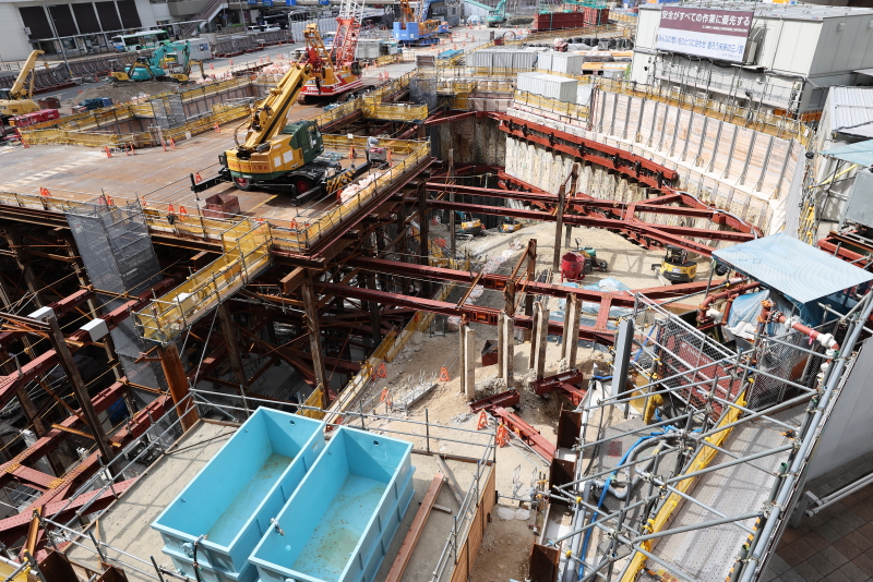 デッキを歩く観光客からも熱い視線を浴びているJR三ノ宮駅ビルの新築工事。工事が先行する北東側。人の広場の北側についての掘削は地下2階程度におさまっています。南側との深さの違いは地下階の構成によるものでしょうか。