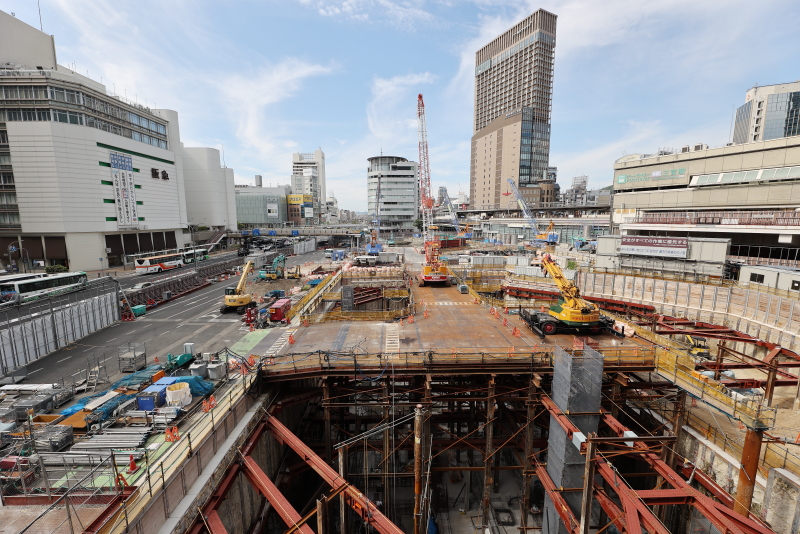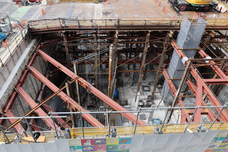 地下には駐輪場や駐車場へのアプローチが設けられる予定です。また人の広場内の人工地盤の上には3棟の低層店舗棟が建設されますが、これらを下から支える基礎も構築されています。