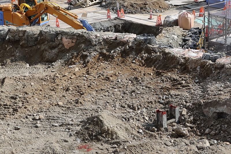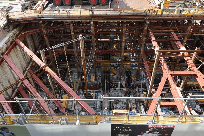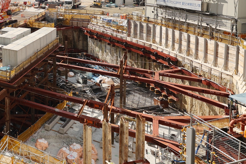 表面が掘削されている地表からH鋼の一部が飛び出ています。南西側の掘削も始まると敷地全体が地中深く掘り進められる事になり、圧巻の光景が広がる事でしょう。