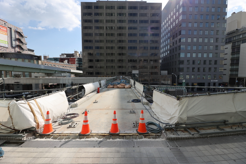 東西を結ぶ新デッキが横切る形になる為、両サイドの欄干を撤去して、新デッキを接合します。表面も剥がされてコンクリートが剥き出しになっています。