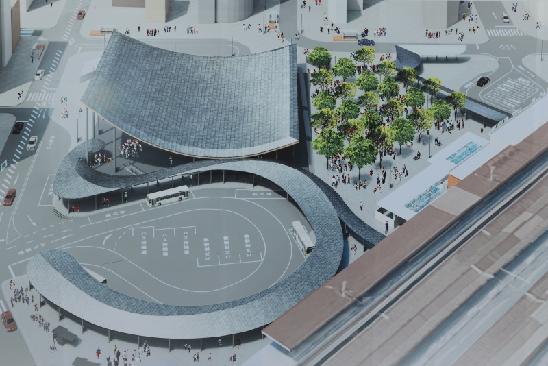 バスロータリーの大きさは現在の規模とほぼ同じのように見受けられます。バスの待機エリアがこれまでの乗降バースの横からロータリー中央に変更されます。新ターミナルもJR駅に接して再整備される為、乗り換えも容易になります。