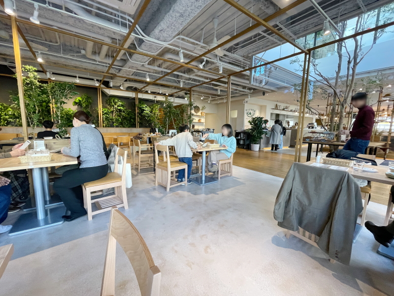 エントランス周りは2層吹き抜けの店内。余裕を感じさせるフロアは食べる植物園の名に相応しく緑でいっぱいです。中央には吹き抜けの天井高を活用してシンボルツリーが地植えされています。