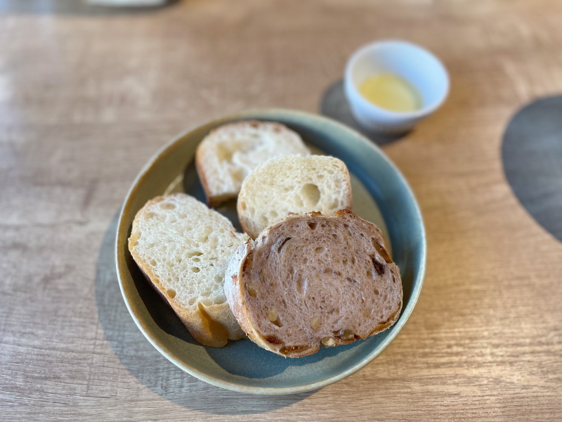 パンビュッフェは食べ放題。隣接するみなとやまベーカリーから焼き立てパンが提供されます。サービスで摘み立てハーブと岩塩を擦り潰したハーブ塩やオリーブオイルを付けてパンを楽しめます。