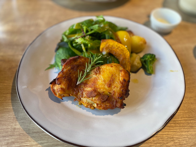 メニューはメインのお肉料理に地元野菜をふんだんに使ったプレートやパスタが選べます。今回はタンドリーチキンをチョイス。ジューシーで柔らかいお肉でした。